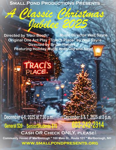 Small Pond Productions is excited to be back, once again, with our annual Holiday show. Enjoy the Season with both old and new favorites, directed by Traci Booth and with music directed by Walt Sayre. Following the music program, we will presenting an original one-act play entitled “Traci’s Place,” written by Walt Sayre. The story takes place at a local tavern, in Southern New Hampshire on Christmas Eve where stranded travelers wander in seeking to escape the on-coming snowstorm.